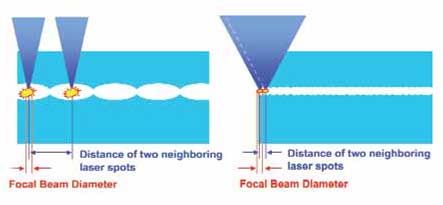 Figure 2 Higher pulse energy (A) allows the use of greater spacing between spots, because the cutting process is driven primarily by expanding cavitation and residual gas bubbles. Lower pulse energy (B) and smaller spot size and volume require substantially more spots with tighter spacing and greater overlap, as the cutting process here is driven primarily by the plasma itself. To deliver this many spots in a reasonable time frame requires a very-high-frequency engine (VISUMAX).