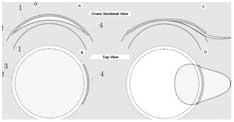 Figure 3. Incision geometry of the ReLEx SMILE procedure. The lenticule cut is performed (the underside of the lenticule), followed by the lenticule sidecuts. Next, the cap interface is created (the upper side of the lenticule), and finally a 2- to 3-mm small incision is created super-temporally. The lenticule interfaces are separated using a flap separator, and the lenticule is extracted manually, all via the small incision.